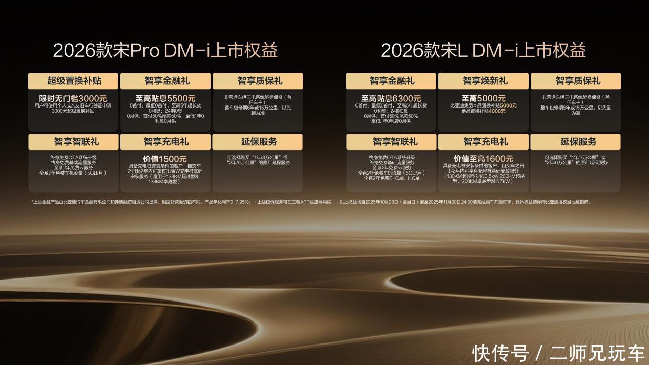 其中,2026款宋L DM-i售价13.98-15.68万元,2026款宋Pro DM-i超级置换权益后,限时售价9.98-12.28万元。同时,两款车型均带来了丰厚的上市权益礼。