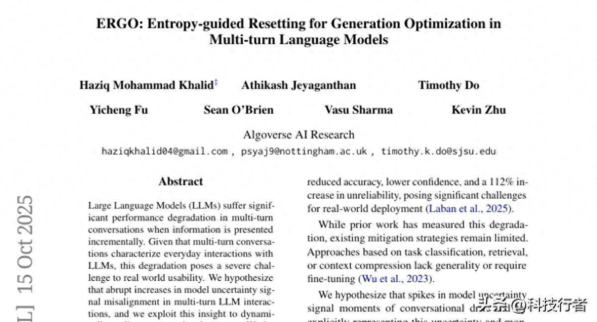 Algoverse AI研究团队的Haziq Mohammad Khalid、Athikash Jeyaganthan、Timothy Do等七位研究人员,在2025年10月发表了一项突破性研究,提出了名为ERGO(Entropy-guided Resetting for Generation Optimization,熵值引导的生成优化重置系统)的解决方案。这项研究发表在arXiv预印本平台,编号为arXiv:2510.14077v1,专门解决大语言模型在多轮对话中性能急剧下降的问题。