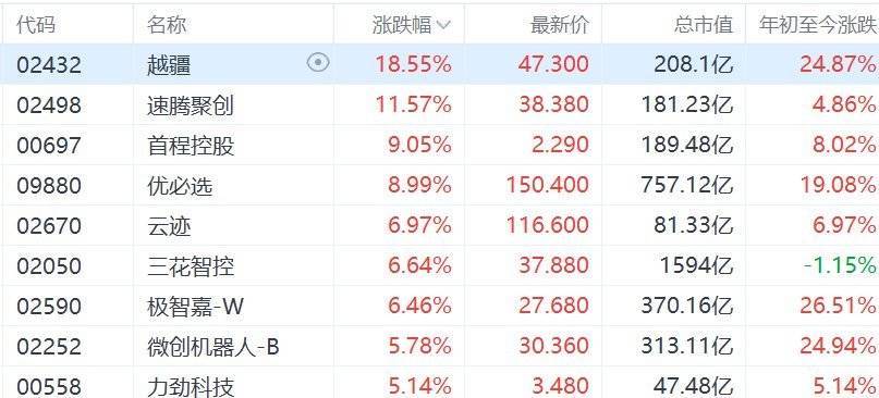 2月20日,港股市场马年首个交易日,在整个市场跳水的背景下,港股机器人概念股集体走强。其中,越疆涨超18%,速腾聚创涨超11%,首程控股涨9%,优必选涨近9%,云迹、三花智控、极智嘉-W涨超6%,微创机器人-B、力劲科技涨超5%。